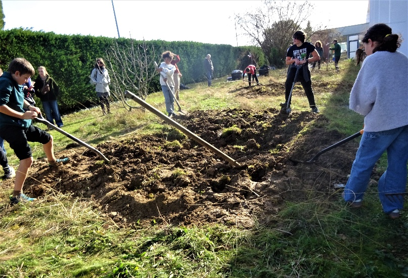 Mme Delevers, notre contact à la pépinière d’Engandou-Taurignan, et 3 adultes accompagnants (David, Paul et Elie) ont fourni tout le matériel vivant et de plantation. Ils ont guidé et conseillé les élèves qui ont dû reboucher les trous gigantesques qui avaient été creusés. Nos élèves ont appris à tailler et planter des fruitiers. Ils ont planté deux arbres et ont posé plein de questions sur ce que nous ferions des fruits, c’était très motivant. Par ailleurs, toutes les conditions étaient réunies pour faire de cette plantation un bel évènement. La météo était de la partie. Les intervenants de la pépinière d’Engandou étaient très agréables et patients avec les élèves. Des responsables du CD 31 nous ont fait l’honneur d’assister à l’évènement et feront un article sur l’ENT du CD 31 ainsi que dans le MAG (magasine du Conseil Départemental à destination des établissements scolaires). Et enfin, le goûter, préparé par M Mathias Barillet (chef de cuisine), était vraiment bienvenu à la fin.